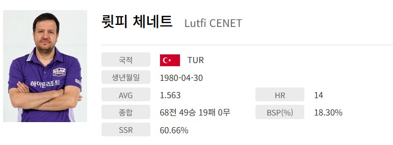 튀르키예 선수인 뤼피 체네트는 통산 68전 49승 19패를 기록하고 있으며 하이런 14점, 뱅크샷 성공률 18.30%, 득점성공률 60.66%입니다. 평균 애버리지는 1.563점입니다.
